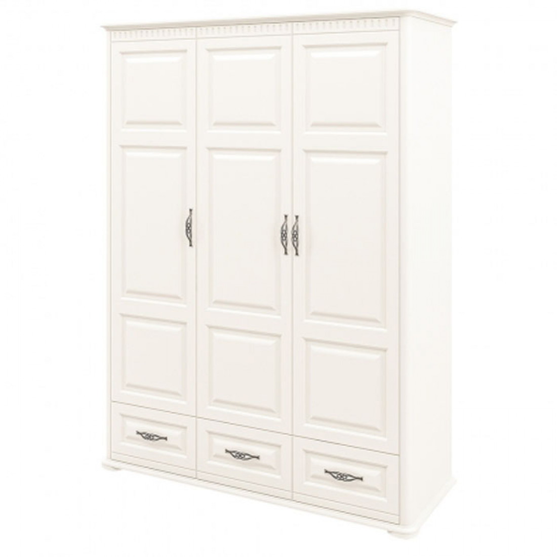 Роскошный трехстворчатый шкаф для одежды и белья МН-126-03(1) в спальню новой серии Марсель (Мебель-Неман) выполнен в светлом кремовом оттенке является настоящим подарком производителя. Купить шкаф можно для комплекта полного спального гарнитура Марсель с другими элементами серии или отдельно.