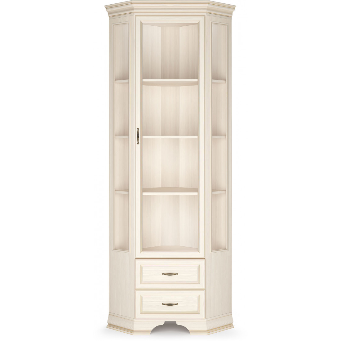 Коллекция производится в текстуре «бодега белый» с эффектом золотого патинирования. Облик «Сиены» дополняют рамочные фасады и карниз в классическом стиле, а также эффектные опоры из МДФ. Мебель комплектуются металлической лицевой фурнитурой премиум-класса в цвете «старая бронза» и надежной крепежной фурнитурой.
