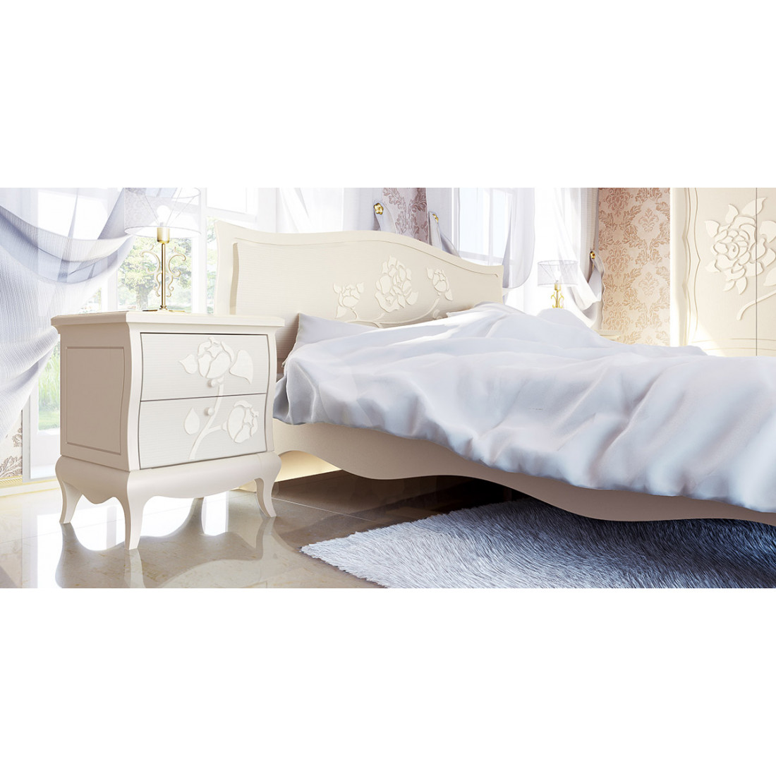 В изголовье кровати формы цвета слоновой кости также дополнены стилизованным 3D- рисунком. Благодаря продуманному общему оформлению, кровать невольно вызывает ассоциации с королевским ложем. Две практичные и одновременно с этим – стильно оформленные прикроватные тумбы добавляют спальному месту не только функциональности, но и создают целостный, законченный вид общей композиции.